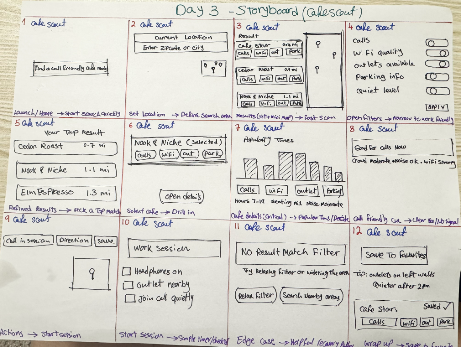 From the Crazy 8s exercise, I chose the layout that felt the clearest for a fast decision: Popular Times on top, followed by the core work friendly badges (Calls, Wi-Fi, Outlets, Parking). I turned this into a simple three panel sketch showing the flow from finding a cafe → checking details → taking the next step.